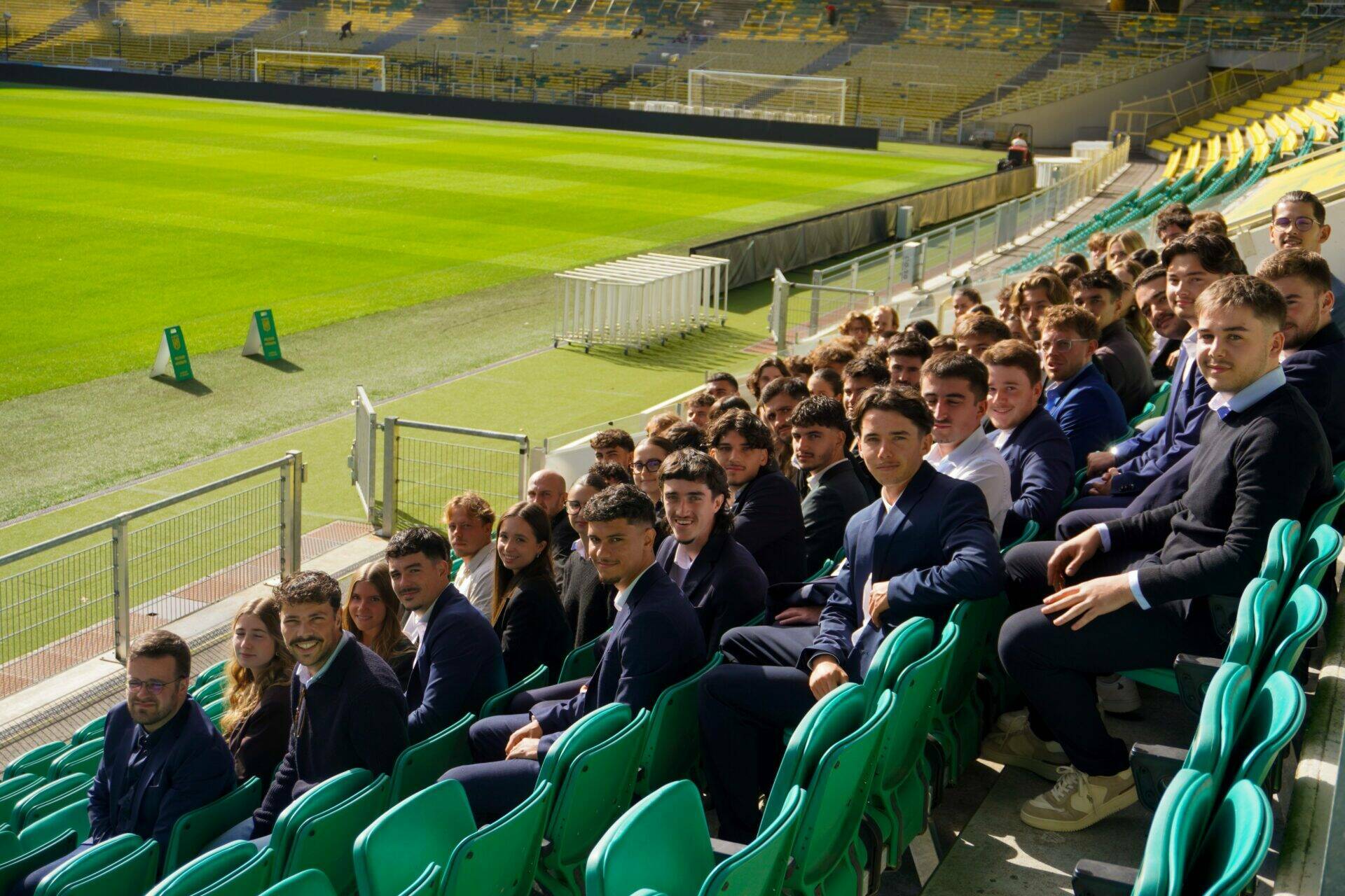 Après cette immersion dans l’espace médiatique, direction la pelouse de la Beaujoire. Les étudiants ont eu l’opportunité de s’approcher au plus près du terrain, de s’installer sur le banc de touche habituellement occupé par les joueurs et le staff technique, et de profiter d’une séance photo symbolique.